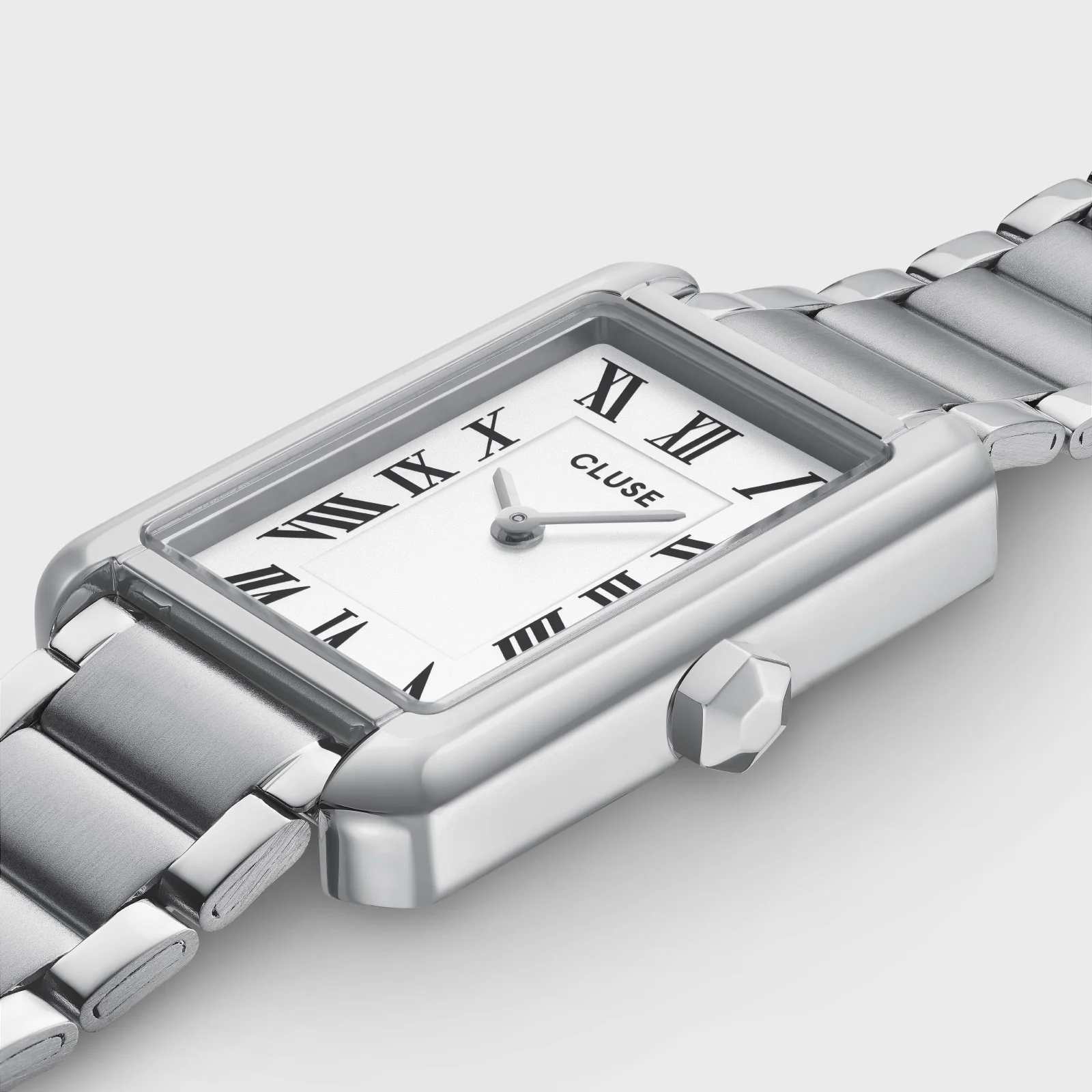 The rectangular Belisenna watch for women features a 21 mm silver coloured case, white vintage looking dial and silver coloured 14 mm 3-link stainless steel strap.