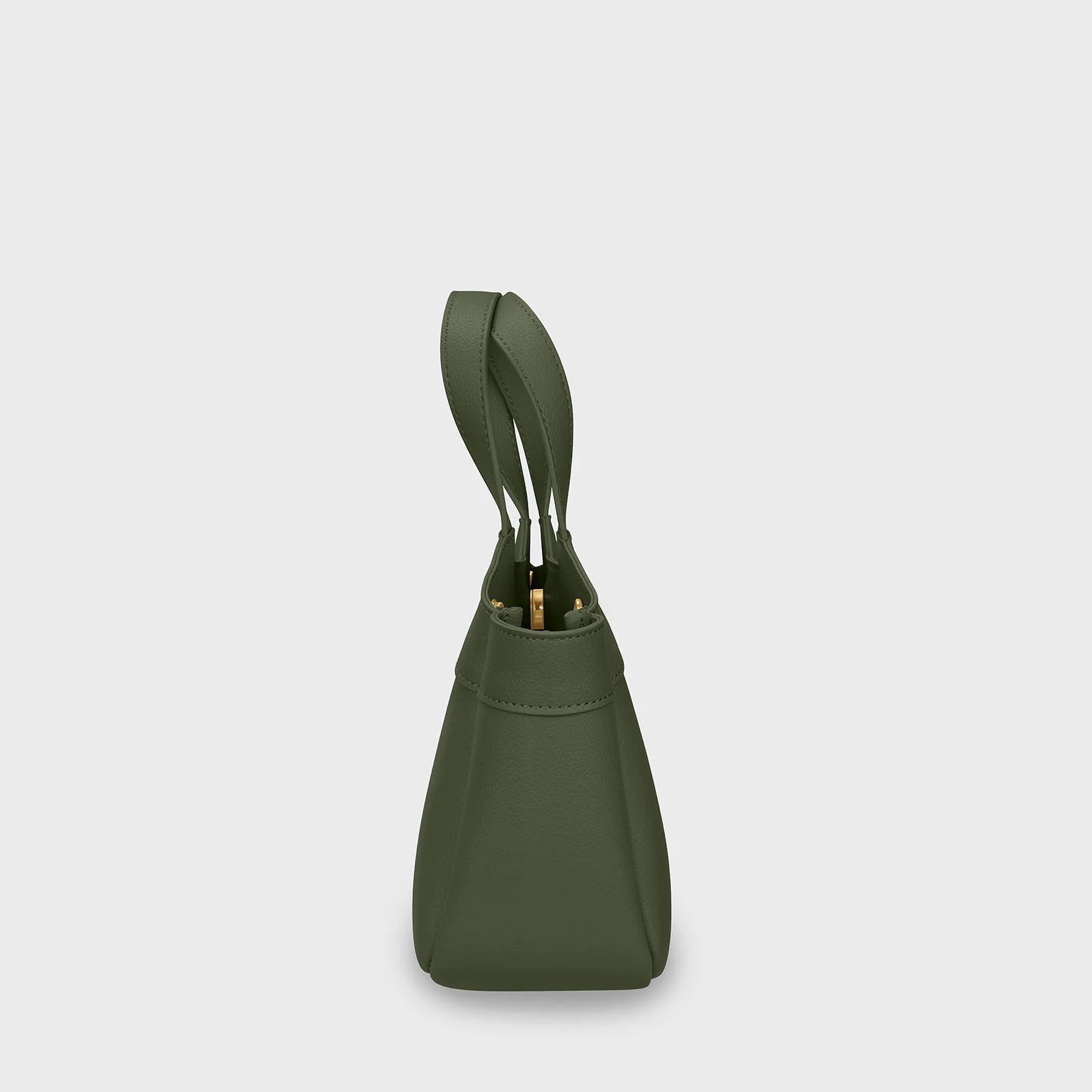 The CLUSE Tote Bag Mini in dark olive green is our second most compact tote, reimagined as a chic everyday handbag. Crafted from OEKO-TEX materials with a grained finish and a recycled PET lining, it measures 35 x 9 x 18 cm with a 2-litre capacity. A magnetic central closure and two side snap buttons keep belongings secure. Inside, a detachable pouch, a side pocket with zipper, and another side pocket on the opposite side add extra organization.